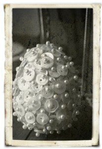берете пуговицу, смазываете её с одной стороны клеем и приклеиваете к основе. Лучше всего пуговицы клеить в круговом направлении. Свободные промежутки заполните клеем и посыпьте на них бисер. Верхушку можно оформить ленточками.
