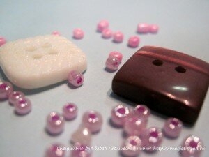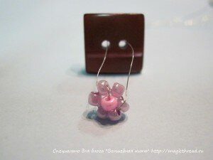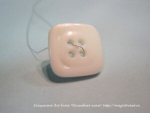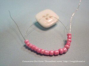Затем на 1 конец проволоку одеваем бисеринку — сердцевину и закрепляем ее посередине. Концы проволоки вставляем в отверстия пуговки.