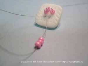 Нанизываем на каждую проволоку по 3 бисерины и продеваем проволоку обратно (на изнанку) уже через другие отверстия.