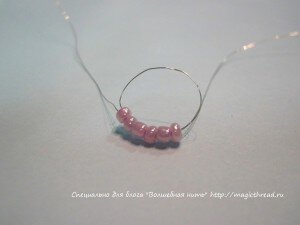 Второе колечко начинаем с плетения цветочка. Навстречу друг другу затягиваем проволоку через 6 бисеринок.