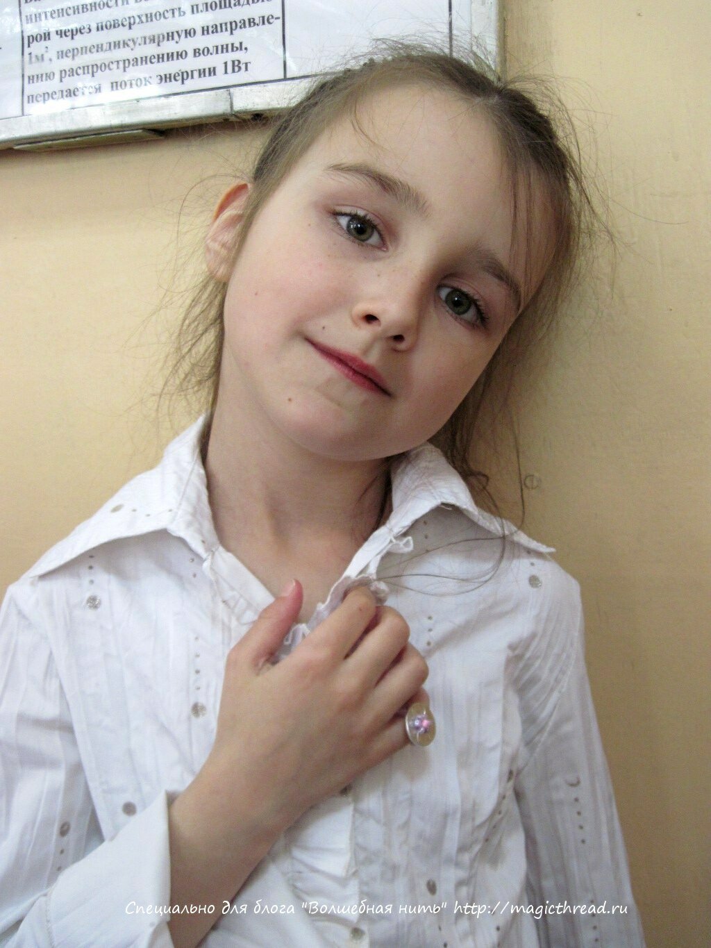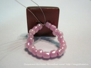 Продеваем оба конца проволоки навстречу друг другу через необходимое нам количества бисера. Для первоклашек это было колечко из 20 бисеринок.