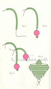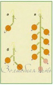 1. начинаем плетение с самой длинной — основной веточки, к которой и будем приплетать бусинки. Для этого надо нанизать на проволоку длиной не менее 20 см около 17-20 бисеринок зеленого цвета.