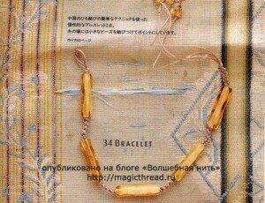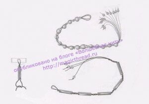 Продолговатые бусы оплетаем так же, закрепляя их квадратным плоским узлом. Застежка — ниточки, украшенные бусинками, с одной стороны и петелька с другой.
