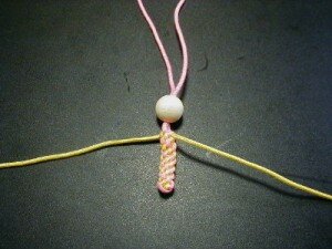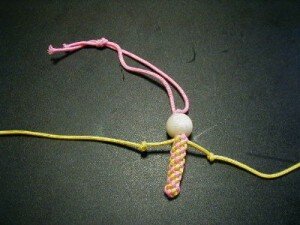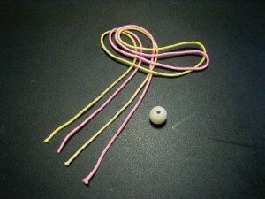Далее разделяем нити. 2 будут ручками, а 2 — пронизываем в бусину. Это голова.
