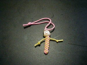 Рисуем личико. Закрепляем нити узлом над бусиной и вверху брелка. Куколка готова.