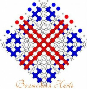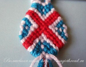 Необходимо приготовить 20 нитей: 10 белых, 4 красных и 6 синих. То есть в каждой половинке будет по 5 белых, 2 красных и 3 синих нити.