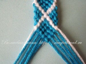 Оплетаем все голубые нити белыми, двигаясь сверху вниз.