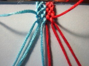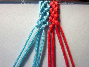 Нам понадобится четное количество нитей. Для мастер класса я использую минимальное количество — всего 8 (4 голубых и 4 красных).