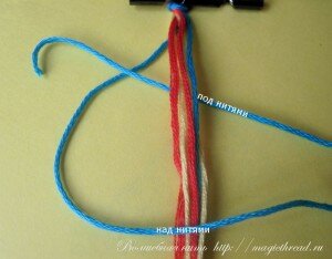 Закрепляем нити на основе. В моем случае закреплено бумагодержателем на книге. Выбираем нить, с которой начнем плетение, выкладываем ее на уголок.