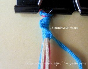 Итак, мы сплели левый петельный узел. Продолжаем плетение до необходимой нам длины. В моем случае это 15 узелков.