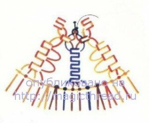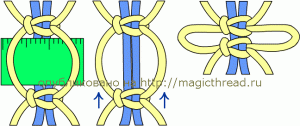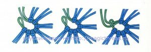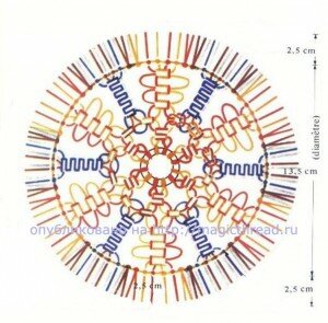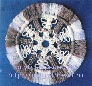 В основе плетения этого панно — квадратный плоский узел и квадратный узел с пико. Диаметр — 18, 5 см. Длина белых нитей не менее 1 м. Серые нити вплетаются позже, их длина не менее 70 см.