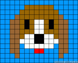 В данной фенечке используются нити 6 цветов. Белый цвет — нити основы, голубой — рабочие нити, ими создается фон, для глаз и носика — черный цвет, голова -светло коричневые нити, а ушки — темно коричневые, язычок красного цвета.