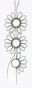 Принцип соединения мотивов показан на этой схеме. Обратите внимание — первые лепестки второго мотива при плетении мы соединяем (пропускаем сквозь) с лепестками предыдущего цветка.