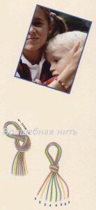 Первый шаг: отрезаем необходимое нам количество нити (мулине).Складываем приготовленные нити (8 цветов) пополам и завязываем узлом, оставляя петлю.