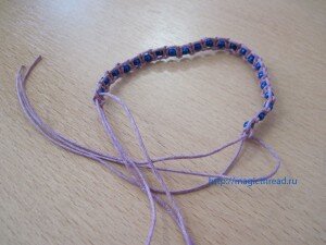 После плетения 4 узлов (рекомендуется от 3 до 6), снова делаем обычный узелок и хвостики прячем при помощи крючка под застежку.