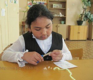Затем начинаем укладывать нити. Настя уже оформляет ножку грибочка. Она придумала, что контур выложит целой нитью, а середина будет пушистой.