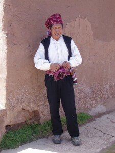 На фото мы видим жителей одного из островов озера Титикака. Все мужчины этой народности вяжут. Труды свои продают туристам.