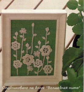 Предлагаю еще один вариант вязаной картины. Белые цветы нежно смотрятся на зеленом фоне.
