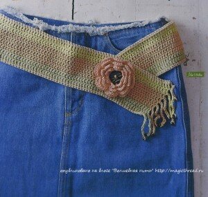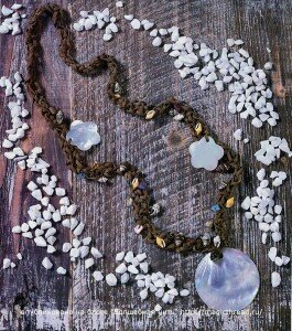 Для работы нам понадобится коричневая пряжа Nabucco (напоминает замшевые ленточки), крючок №6 или 7, перламутровые украшения и маленькие разноцветные ракушки.