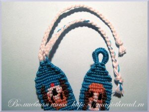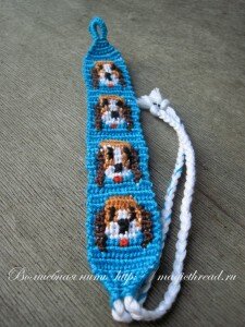 В данной фенечке используются нити 6 цветов. Белый цвет — нити основы, голубой — рабочие нити, ими создается фон, для глаз и носика — черный цвет, голова -светло коричневые нити, а ушки — темно коричневые, язычок красного цвета.