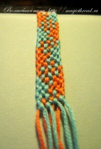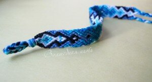 Следите за цветом узелка, тогда все получится! Узелок всегда должен быть цвета рабочей нити. Если только учитесь плести фенечки (сплели до этого всего 2-3 фенечки), то проверяйте цвет узелков по схеме. Например, в нашей фенечке 1 ряд — все синие узелки, 2 ряд — все коричневые, 3 ряд — 1 коричневый узелок и 3 синих и т.д.