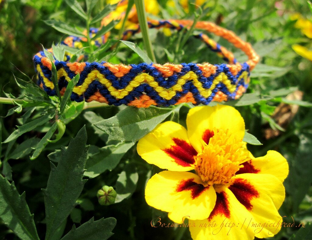Для работы нам понадобится: 6 нитей цвета бокового треугольничка (у меня — оранжевые нити), 1 нить — центральная линия зигзага (у меня желтая) и 2 нити контура зигзага (у меня -синие).