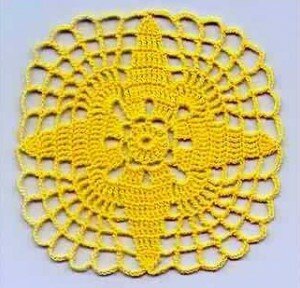 Туловище (1 деталь). Свяжите жёлтой пряжей цепочку из 20 в.п., замкните её в кольцо полустолбиком, а затем провяжите по спирали пять рядов ст.б.н. В шестом ряду провяжите «шишечку», 9 ст.б.н., в десятый столбик — «шишечка», 9 ст.б.н.