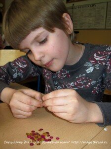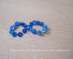 Сначала нам надо создать линию из 10 пайеток. Отрезаем проволоку, складываем пополам и одеваем на середину первую пайетку (надеваем на один конец проволоки).