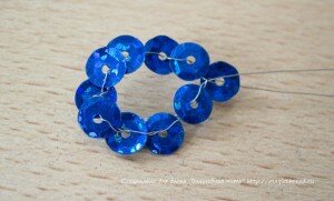 Когда нанизано 10 пайеток — делаем петельку: один конец проволоки вставляем в серединку первой пайетки ряда.