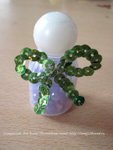 Этот бантик плетется из пайеток, нанизанных и закрепленных на проволоке для бисероплетения. Хорошо держит форму. Техника выполнения очень проста: