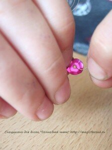 Затем перекручиваем 2 раза. Двумя пальчиками одной руки держим пайетку, двумя пальчиками другой — проволоку очень близко к пайетке и делаем 2 оборота (не более).