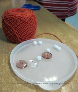 Для работы нам понадобятся нитки (или вощеный шнур), 3 пуговки и 6 бусинок.