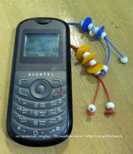 Если у вас остались лишние пуговки и бусины, предлагаю сделать брелочек для телефона. Девочкам очень понравилось.