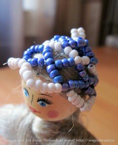 1. Делаем петельку — помпончик для панамки. Нанизываем 6 бисеринок, затем пропускаем проволоку через первую из набранных. Внимание: на одном конце проволоки оставляем 5-7 см, продолжаем работу длинным концом.