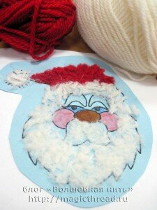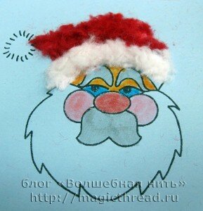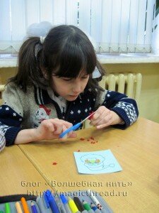 Сначала мы раскрасили лицо дедушки Мороза. Затем постригли ниточки. Нина сделала пучок из красной нити и старается резать ее мелко — мелко.