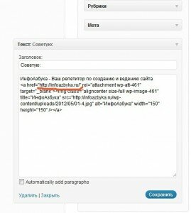 3. Публикуем картинку в любой статье сайта (подбирайте по смыслу, конечно). Об этом уже писала в статье «Как сделать кнопочку сайта» — можно внизу расположить — будет, как подпись.