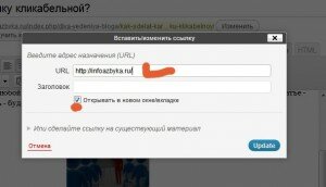 и вставляем туда адрес сайта или адрес нужной Вам страницы. Обязательно отметьте, чтобы открывалась в новом окне! Обновляем запись!