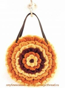 Предлагаю Вашему вниманию интересный вариант сумочки. Необходимо будет связать 2 круга, полоску — ремень и цветок для украшения.
