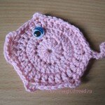 При вязании я не делала цепочку воздушных петель, а сразу провязала столбики с накидом в волшебное кольцо (21 сн). Для бровей сделала пико из 3 воздушных петель, а для ножек — из 4 вп. Увеличила и длину хвостика до 8 вп.