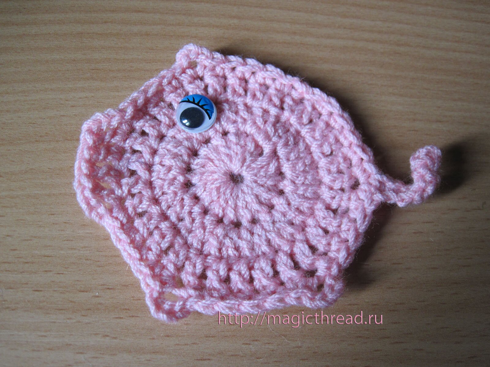 Теперь думаю, как лучше использовать: в качестве подстаканника или как прихватку для крышек. Схема вязания поросеночка: