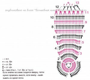 Для внешних лепестков каждый раз вязать со 2-го по 13-й ряд, смещая их от внутренних лепестков. Ст. с/н. вязать позади вокруг ст. с/н. 1-го ряда. Лепестки соединить в 4-м ряду при помощи пс. б/н. Цифры указывают номера рядов.