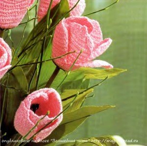 Для работы Вам понадобится х/б пряжа (цвет выбирайте по вкусу), крючок № 1,25-1,5 и искусственные стебли тюльпанов с листьями.