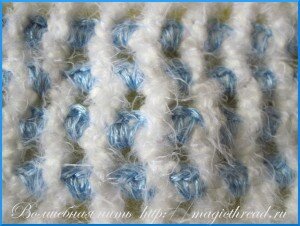 В качестве эксперимента можно попробовать связать узор разными типами пряжи. Например, белая — лотос травка стрейч и голубая — х/б. Пряжа по своей толщине разная, поэтому во 2 ряду вяжется по 3 столбика без накида в каждую петлю предыдущего ряда.