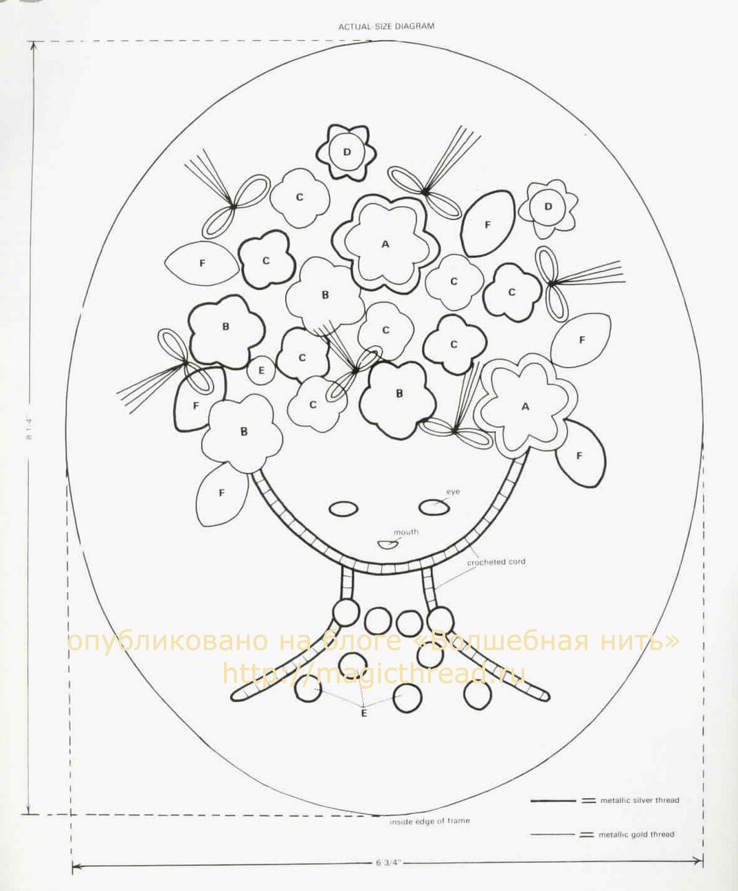 Над каждой схемой вязания цветка есть обозначения: flower A, B, C,D,F. Это поможет Вам при создании композиции. Каждый из цветков выполняется по несколько раз. Например, Вам понадобится 2 цветка А и 4 цветка В. Смотрите далее по схеме.