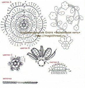 Нам понадобятся рамки, ткань для фона и белая пряжа. Для круглой рамочки мы вяжем 3 вида цветов и 3 вида листиков. Лист А на данной схеме, а листики В и С на схеме к овальной рамочке.