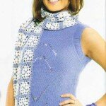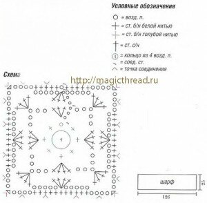 Каждую полосу вязать из 2 незаконченных ст. с/н, провязывая их в точку соединения 1-го квадрата, затем соседнего. Получится полоса длинной 16 квадратов и шириной 4 квадрата. Затем соединить мотивы поперек. Обвязать шарф 1 р. из незаконченных ст. с/н. + 2 возд. п.