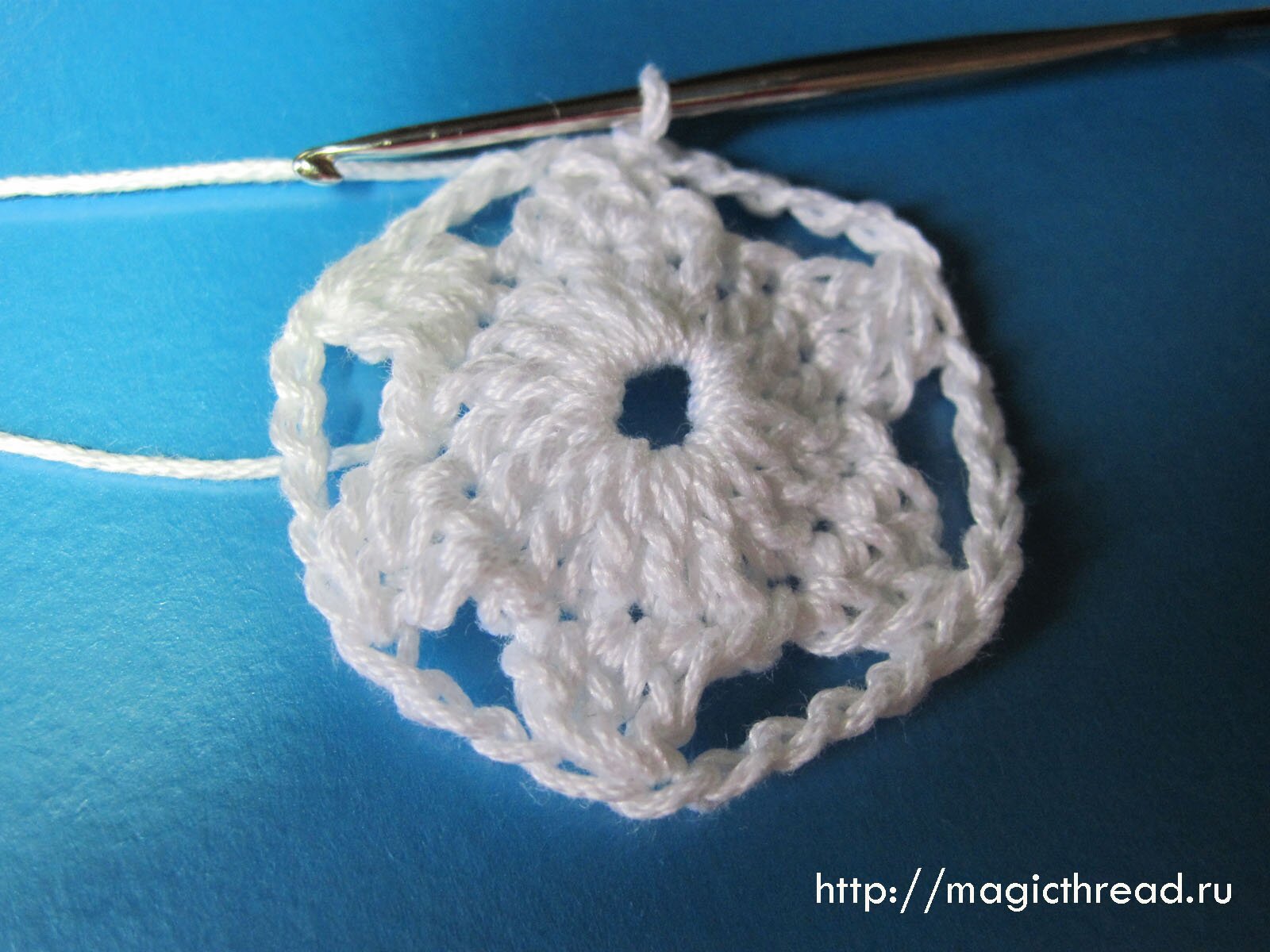 Над 2 по счету арочкой: 3 вп, столбик без накида, 3 вп. Таким образом провязать весь круг.