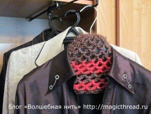 1 ряд: цепочка из 10 воздушных петель, соединенная в кольцо. Я сразу проверила ее на крючке одной из вешалок. Одевается легко!