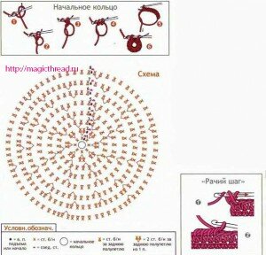 выполнить начальное кольцо и связать 8 р. по схеме. В итоге мы получим круг = 72 п.