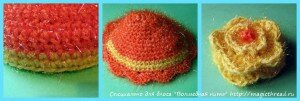 Далее добавляем круг другого цвета (в нашем случае — желтого). Он полностью провязывается столбиками без накида. Затем еще один ряд столбиками без накида оранжевого цвета, и послений ряд — арочки (6 столбиков с накидом в одну петлю). Осталось только связать цветок и пришить его к шапочке.